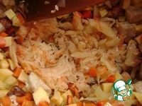 Добавить репу, если репа горчит, ошпарьте ее кипятком перед опусканием. Разгрести середину чаши и выложить туда квашеную капусту. Жарить 3-4 минуты. |