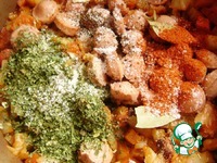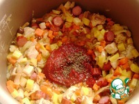 Перемешать и снова освободить середину чаши. Выложить туда томатную пасту, посыпать сахаром и тмином и прогреть под крышкой пару минут. |