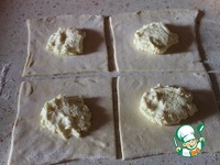 Слегка раскатать слоеное тесто и разрезать на 4 квадрата. На каждый квадрат положить по 1 ч. л. ( с горкой) творожной начинки. |