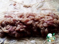 Болгарский перец ( у меня был зеленый, как видно из фото ), режем, можно мелко, можно как у меня. Укладываем перец на рулет. |