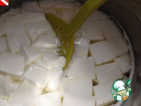 Получившийся сгусток нужно разрезать (в этой же емкости) на кубики со стороной размером 1,5-2 см. Если посмотрите сверху, то должен получиться рисунок в виде решетки. |