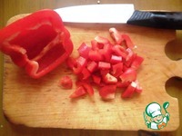 Перец вымыть, обсушить, удалить семенную коробочку, нарезать кубиками. Добавить в сковороду к луку. |