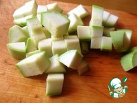 Вымытый и обсушенный кабачок нарезать кубиками. Добавить к луку с перцем |