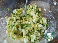 Приготовьте начинку : рис, измельченные вареные яйца, перья зеленого лука, зелень укропа. Посолить, добавить 2 ст. л. масла растительного. Перемешать. |