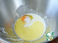 Включить духовку, нагревать до 180 градусов. А в это время в чаше миксера взбить на средней скорости ( можно венчиком) кефир, яйцо и белки, соль, масло растительное. |