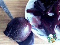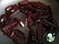 Положить в сковороду свеклу и прогревать, помешивая, до испарения жидкости. Брусочки свеклы покроются вкуснейшей глазурью. |