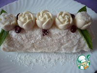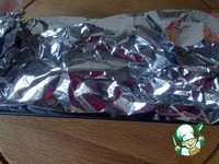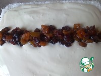 Посередине выложить приготовленные сухофрукты из кураги и клюквы и при помощи фольги свернуть рулет. |