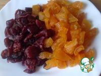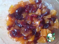 Курагу и вяленую клюкву протомить в соках (апельсиновом и клюквенном) до испарения жидкости. |