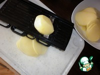 Очищенный картофель нарезать тонкими ломтиками (с помощью овощерезки). |