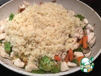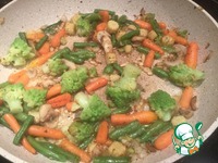 На раскалённую сковородку налейте 1 ст масла и обжарьте овощи (неразмораживая), выдавите прессом зубчик чеснока и добавьте к овощам. Жарьте примерно 5-7 минут. Выложите. |
