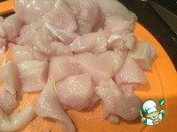 Куриное филе помойте, высушите бумажным полотенцем, нарежьте на маленькие кусочки. На той же сковороде, добавив растительное масло, жарьте, помешивая, куриное филе около 10 минут. |