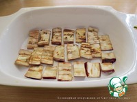 Баклажан нарезать, обжарить в течении 5 минут на сковороде. Форму смазать маслом и положить баклажаны. |