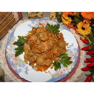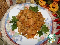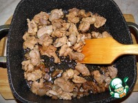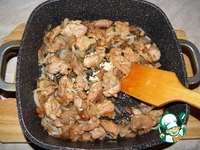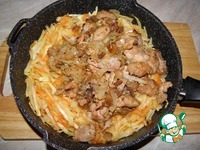 Выложить мясо со шкварками. Если капуста не сочная, добавить каплю воды. |