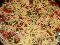 Сверху посыпьте тёртым сыром, полейте майонезом и поставьте в разогретую духовку до 220 градусов. Выпекать до румяной корочки. |