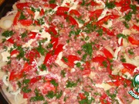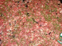 Сверху выложите ещё немного фарша и зелёного лука. |
