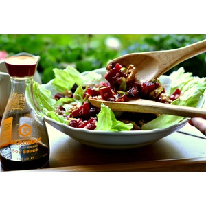 В отдельной миске смешать подсолнечное масло, соевый соус"Киккоман", мед, черный перец и имбирь. Взбить венчиком. Полить салат соусом. |