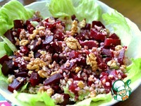 На дно салатницы выкладываем листья салата, гречку и свеклу. Добавим поломанные орехи. |
