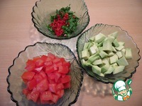 Помидоры (вычистив семена) и авокадо нарезать кубиками, авокадо залить лимонным соком. Петрушку и чили измельчить. |
