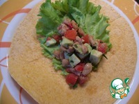 На лепешку выложить лист салата, не него (в середину) - начинку. Тортилью свернуть конвертиком, связать зеленым луком. |