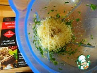 Приготовим песто из петрушки: петрушку крупно рубим ножом (я использовала зелень вместе со стеблями). Сыр натираем на мелкой терке. Орехи прокаливаем 2-3 минуты на сухой сковороде. |