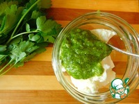 Соус-начинку для мяса на основе песто упаковываем в баночку-этот соус "поедет" на пикник. |