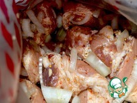 Лук и чеснок добавляем к мясу, снова закрываем пакет и перемешиваем. Оставляем мариноваться мясо 3-4 часа. |