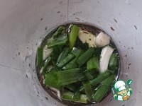 Зелень, чеснок и лук мелко нарезать. Измельчить зелень блендером, добавить масло, уксус и все специи. Еще раз тщательно взбить. |