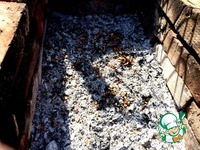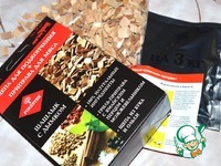 Из пакетика со щепой выливаем воду, а саму щепу раскидываем на угли. |
