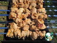 Заранее подготовить угли в мангале, они должны подёрнуться белым пеплом. Мясо нанизать на классические шампура и обжаривать на мангале, часто поворачивая их, до готовности, примерно 25-30 минут. |