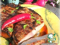 Выложить аппетитный кусок мяса на большое блюдо, подать с овощами. Каждый отрезает себе от него порционные стейки и с удовольствием съедает с овощами. Приятного аппетита! |