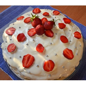 Покрываем кремом верхний корж. Украшаем ягодами. Можно по желанию присыпать тертым шоколадом или сахарными шариками |
