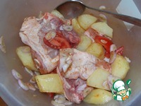 Добавить к курице картофель и залить соусом. Перемешать. Оставить на 10-15 минут. |