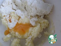Сливочное масло комнатной температуры растереть с сахаром в однородную массу. Затем добавить творог и желток. Хорошо перемешать. |