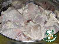5. Готовим соус: смешиваем сметану с мелко порезанным чесноком и соевым соусом. 6. Заливаем подготовленную курочку соусом и оставляем мариноваться (я хотела оставить на часик, а получилось на 3…). |