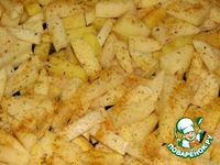 7. На смазанный маслом противень укладываем порезанный брусочками картофель. Солим, посыпаем свежемолотым перцем, приправой «Для картофеля». Добавляем немного воды. |