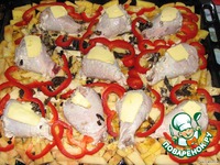 9. На каждый кусочек курочки кладём небольшой кусочек сливочного масла. 10. Нарезаем перец соломкой и выкладываем между кусочками курочки. |