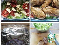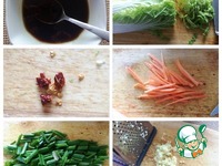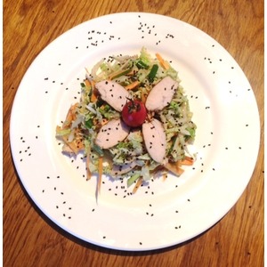 В салате я использовала куриную грудку запеченную в духовке, приготовила ее накануне, так что этот шаг можете пропустить и использовать имеющееся у вас мясо, даже просто отварное. Кроме того, специально для этого салата я купила кунжутное масло, это нечто, очень вкусно, так что рекомендую не заменять его, вкус будет уже не тот. И еще, я готовила строго по рецепту, т. к. первый раз, я всегда так поступаю, нам было очень остро (я сразу вспомнила себя в Тайланде, какая там была острая еда), так что внесу некоторые свои изменения, но в скобках укажу как было в оригинале.