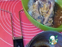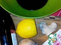 Для маринада смешать соевый соус, вино, цедру лимона, натертый имбирь, готовый хрен, нарезанный кольцами лук и измельченный чеснок |