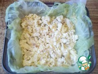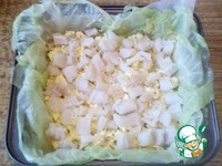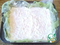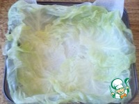 Теперь в форму, застеленную пергаментом, нужно уложить капустные листы (с бортиками). |