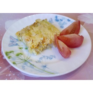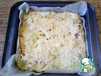 За 3 минутки до окончания приготовления достать пирог из духовки и посыпать тёртым сыром. Отправить обратно в духовку на пару минут, чтобы сыр подплавился. |
