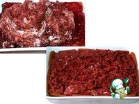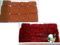 200 г печенья разложила, как основу на дно формы и сделала из него бортики. ( Пропорции соблюдать не обязательно.) Основу густо намазала малиновым вареньем. |