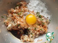 Добавить измельченную зелень, яйцо, крахмал и соевый соус. Добавить немного тимьяна. Если у вас маленькие яйца, добавьте 2 штуки. |