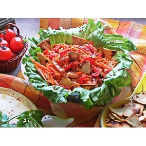 В салатник укладываем салатные листья, сверху весь салат. Украшаем хрустящими чипсами и семечками кунжута. |