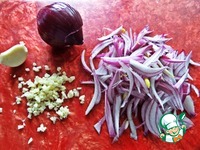 В это время чистим лук, чеснок. Лук нарезаем тонкими полосками, чеснок просто измельчаем. |