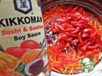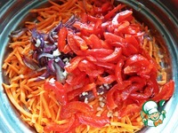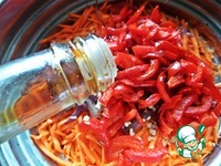 Помягчевший перец высыпаем вслед за луком к морковке. Остатки масла можно вылить тоже в салат. |