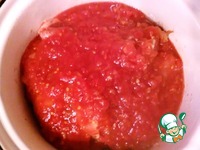 Сверху заливаем томатным томатным соком. Не перемешиваем. Сок сам постепенно проникнет в мясо. Оставляем при комнатной температуре на 6 часов. |