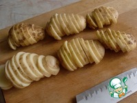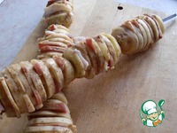 Выберите картошку средних размеров и хорошо её промойте, чистить не нужно. На шампуре помещается 3 шт. Нарежьте картошку на дольки, шириной, примерное, чуть меньше сантиметра. |