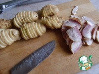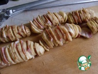 Нарежьте сало (или бекон) на дольки шириной 0,5 см. В выборе продукта есть небольшая разница. Бекон даст тот самый копченный вкус, с салом картошка получится более нежной. На вкус и цвет :) |