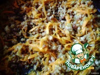 Фарш обжарить на подсолнечном масле, добавить мелко нарезанный лук, обжарить. Затем добавить натертую на терке морковь, хорошо перемешать, обжарить вместе с фаршем и луком. |