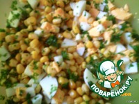 Отваренные вкрутую яйца нарезать кубиками или натереть на крупной терке, добавить консервированную кукурузу, мелко нарезанную петрушку, остывший фарш, соль, перец. |